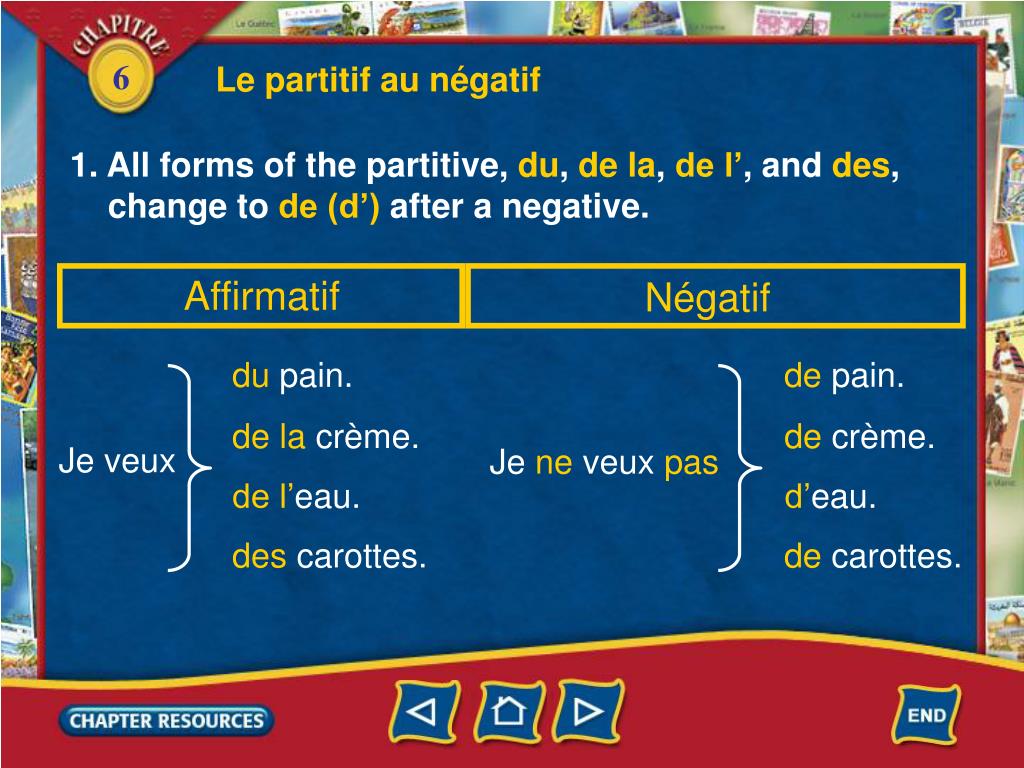 Je veux Je ne veux pas Le partitif au négatif 1. All forms of the partitive, du, de la, de l’, and des, change to de (d’) after a negative. Affirmatif Négatif du pain. de pain. de la crème. de crème. de l’eau. d’eau. des carottes. de carottes.