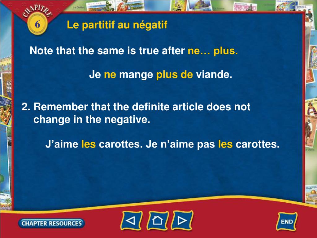 Le partitif au négatif Note that the same is true afterne… plus. Je ne mange plus de viande. 2. Remember that the definite article does not change in the negative. J’aimeles carottes. Je n’aime paslescarottes.