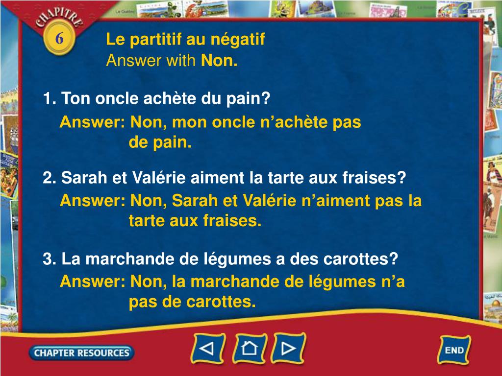 Le partitif au négatif Answer with Non. 1. Ton oncle achète du pain? Answer: Non, mon oncle n’achète pas de pain. 2. Sarah et Valérie aiment la tarte aux fraises? Answer: Non, Sarah et Valérie n’aiment pas la tarte aux fraises. 3. La marchande de légumes a des carottes? Answer: Non, la marchande de légumes n’a pas de carottes.