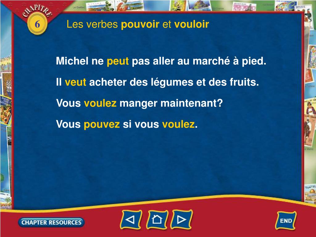 Les verbes pouvoir et vouloir Michel ne peut pas aller au marché à pied. Il veut acheter des légumes et des fruits. Vous voulez manger maintenant? Vous pouvez si vous voulez.