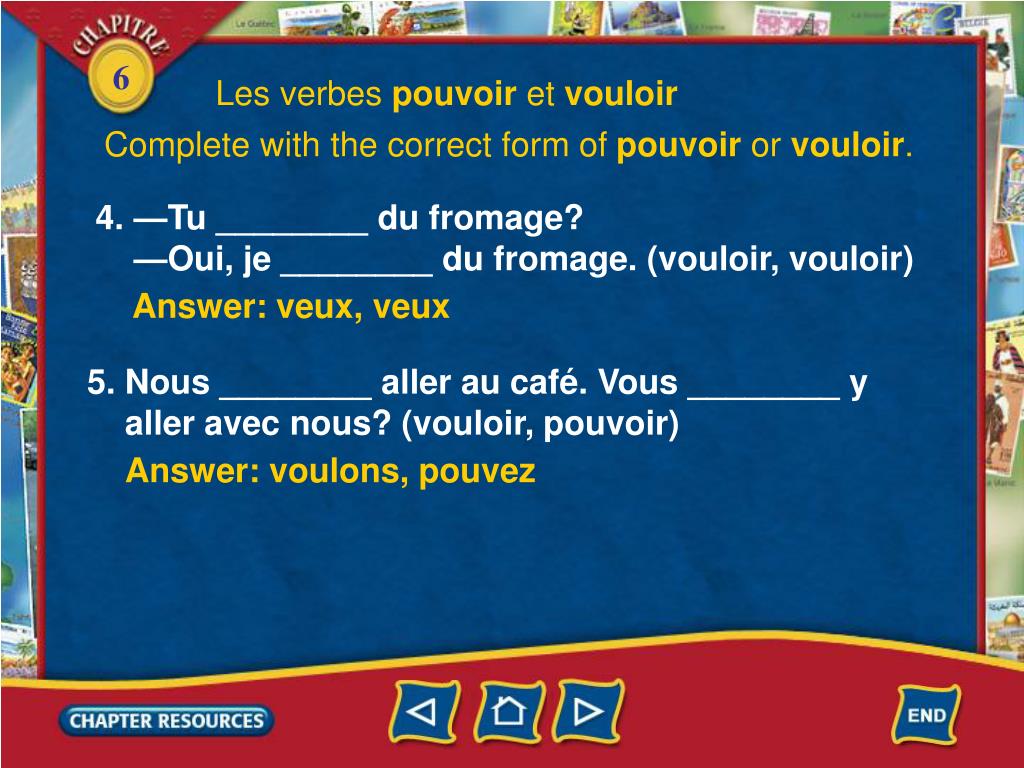 Les verbes pouvoir et vouloir Complete with the correct form of pouvoir or vouloir. 4. —Tu ________ du fromage? —Oui, je ________ du fromage. (vouloir, vouloir) Answer: veux, veux 5. Nous ________ aller au café. Vous ________ y aller avec nous? (vouloir, pouvoir) Answer: voulons, pouvez
