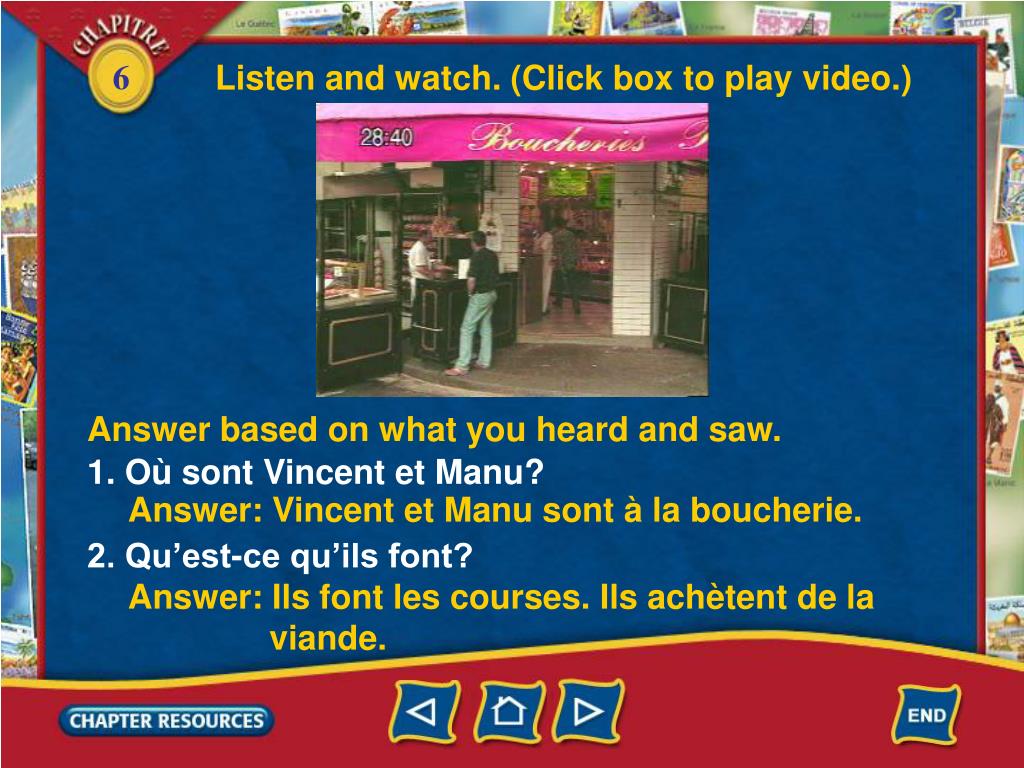 Listen and watch. (Click box to play video.) Answer based on what you heard and saw. 1. Où sont Vincent et Manu? Answer: Vincent et Manu sont à la boucherie. 2. Qu’est-ce qu’ils font? Answer: Ils font les courses. Ils achètent de la viande.