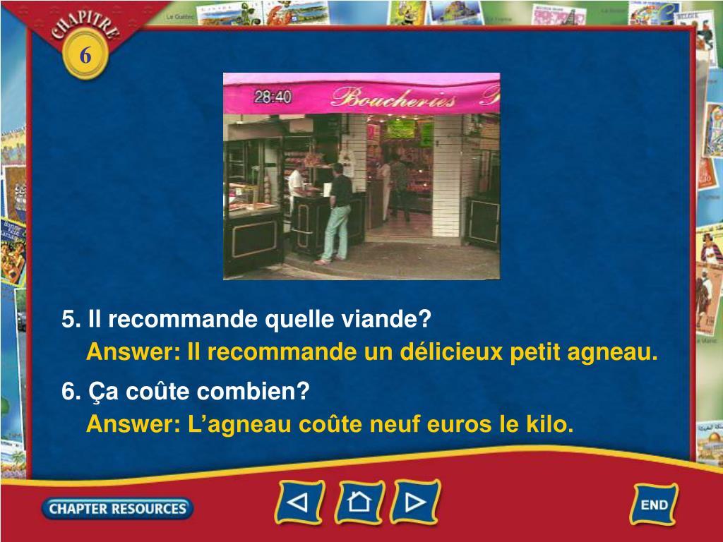 5. Il recommande quelle viande? Answer: Il recommande un délicieux petit agneau. 6. Ça coûte combien? Answer: L’agneau coûte neuf euros le kilo.