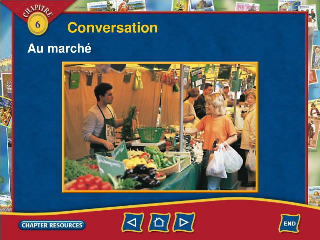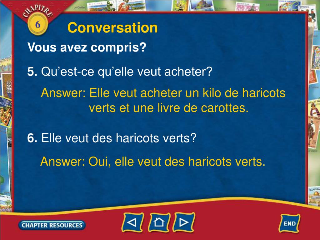 Conversation Vous avez compris? 5. Qu’est-ce qu’elle veut acheter? Answer: Elle veut acheter un kilo de haricots verts et une livre de carottes. 6. Elle veut des haricots verts? Answer: Oui, elle veut des haricots verts.