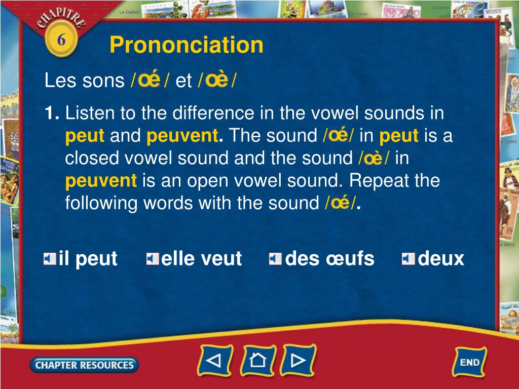 Prononciation Les sons //et // 1. Listen to the difference in the vowel sounds in peut and peuvent. The sound / /in peutis a closed vowel sound and the sound / /in peuvent is an open vowel sound. Repeat the following words with the sound / /. il peut elle veut des œufs deux