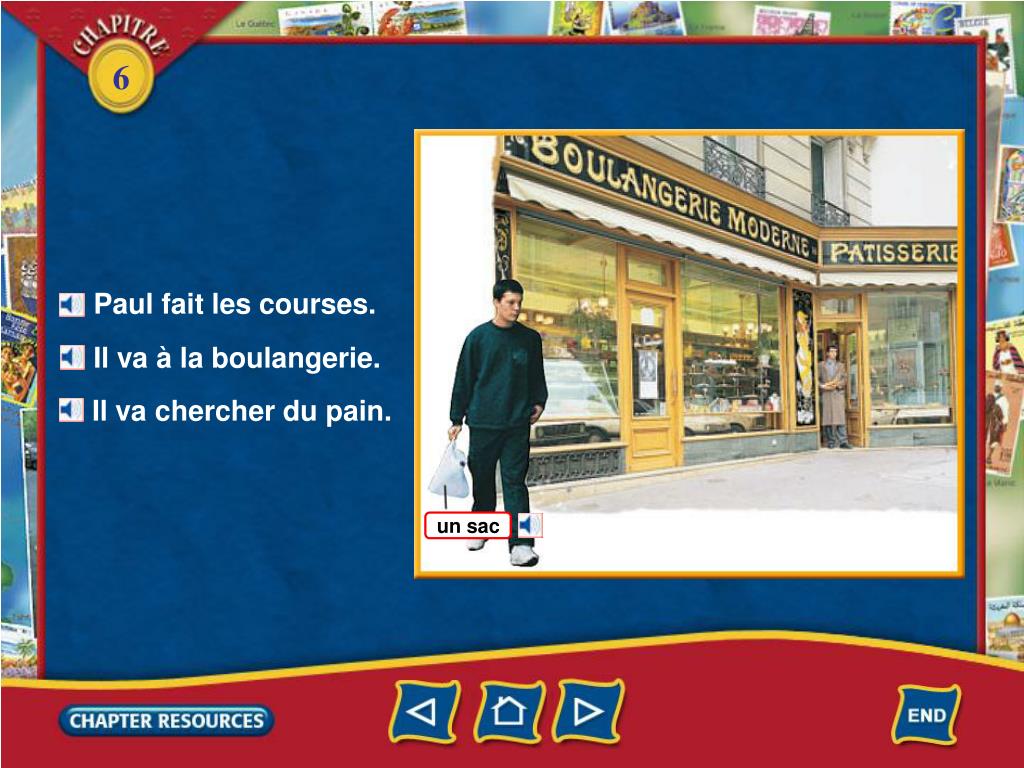 Paul fait les courses. Il va à la boulangerie. Il va chercher du pain. un sac