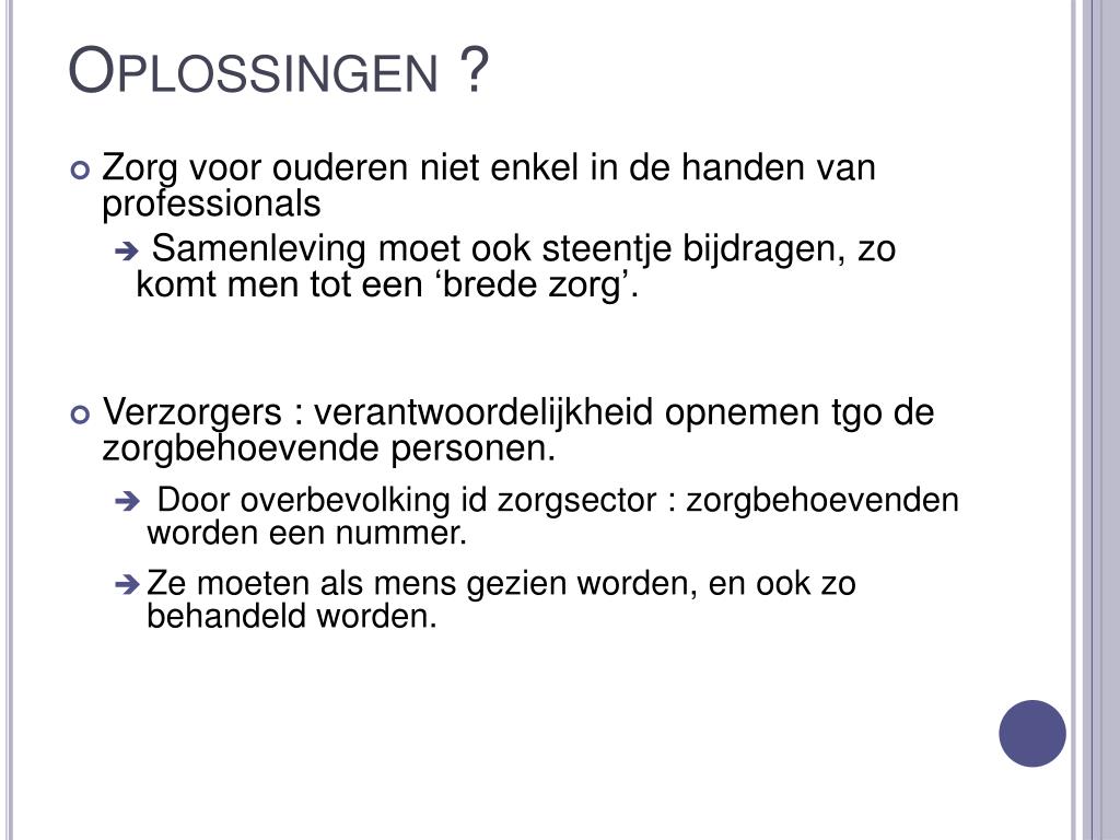 Oplossingen ? • Zorg voor ouderen niet enkel in de handen van professionals • Samenleving moet ook steentje bijdragen, zo komt men tot een ‘brede zorg’. • Verzorgers : verantwoordelijkheid opnemen tgo de zorgbehoevende personen. • Door overbevolking id zorgsector : zorgbehoevenden worden een nummer. • Ze moeten als mens gezien worden, en ook zo behandeld worden.