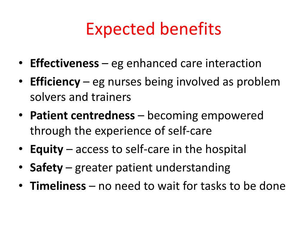 Expected benefits • Effectiveness – eg enhanced care interaction • Efficiency – eg nurses being involved as problem solvers and trainers • Patient centredness– becoming empowered through the experience of self-care • Equity – access to self-care in the hospital • Safety – greater patient understanding • Timeliness – no need to wait for tasks to be done