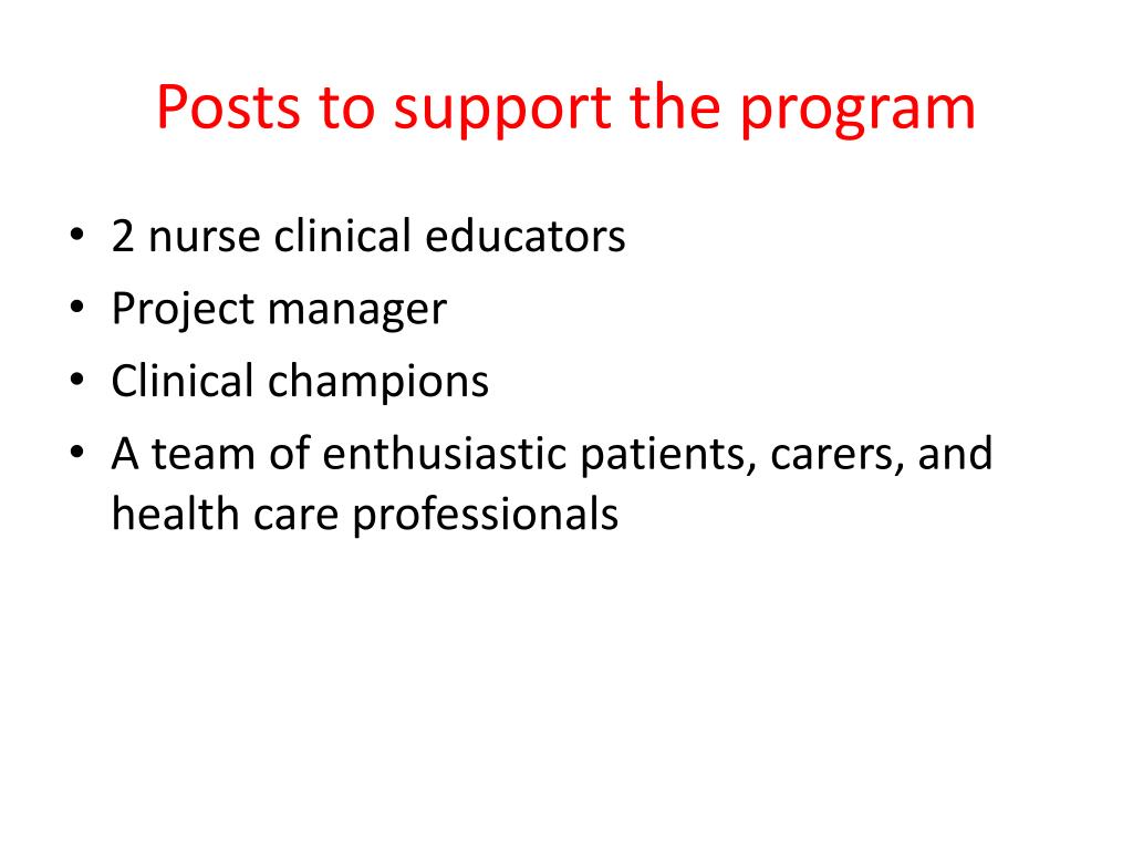 Posts to support the program • 2 nurse clinical educators • Project manager • Clinical champions • A team of enthusiastic patients, carers, and health care professionals