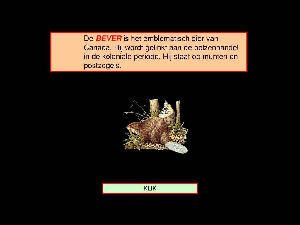 De BEVER is het emblematisch dier van Canada. Hij wordt gelinkt aan de pelzenhandel in de koloniale periode. Hij staat op munten en postzegels. KLIK