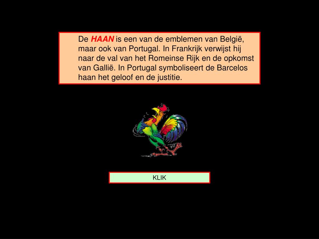 De HAAN is een van de emblemen van België, maar ook van Portugal. In Frankrijk verwijst hij naar de val van het Romeinse Rijk en de opkomst van Gallië. In Portugal symboliseert de Barcelos haan het geloof en de justitie. KLIK