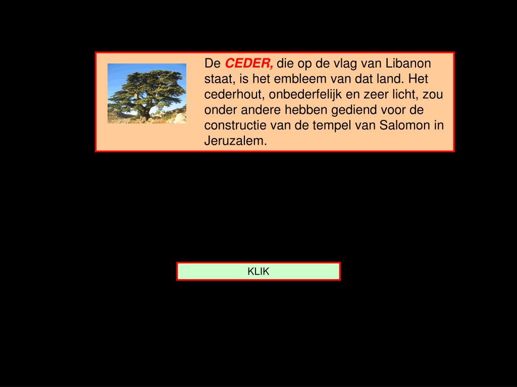 De CEDER, die op de vlag van Libanon staat, is het embleem van dat land. Het cederhout, onbederfelijk en zeer licht, zou onder andere hebben gediend voor de constructie van de tempel van Salomon in Jeruzalem. KLIK