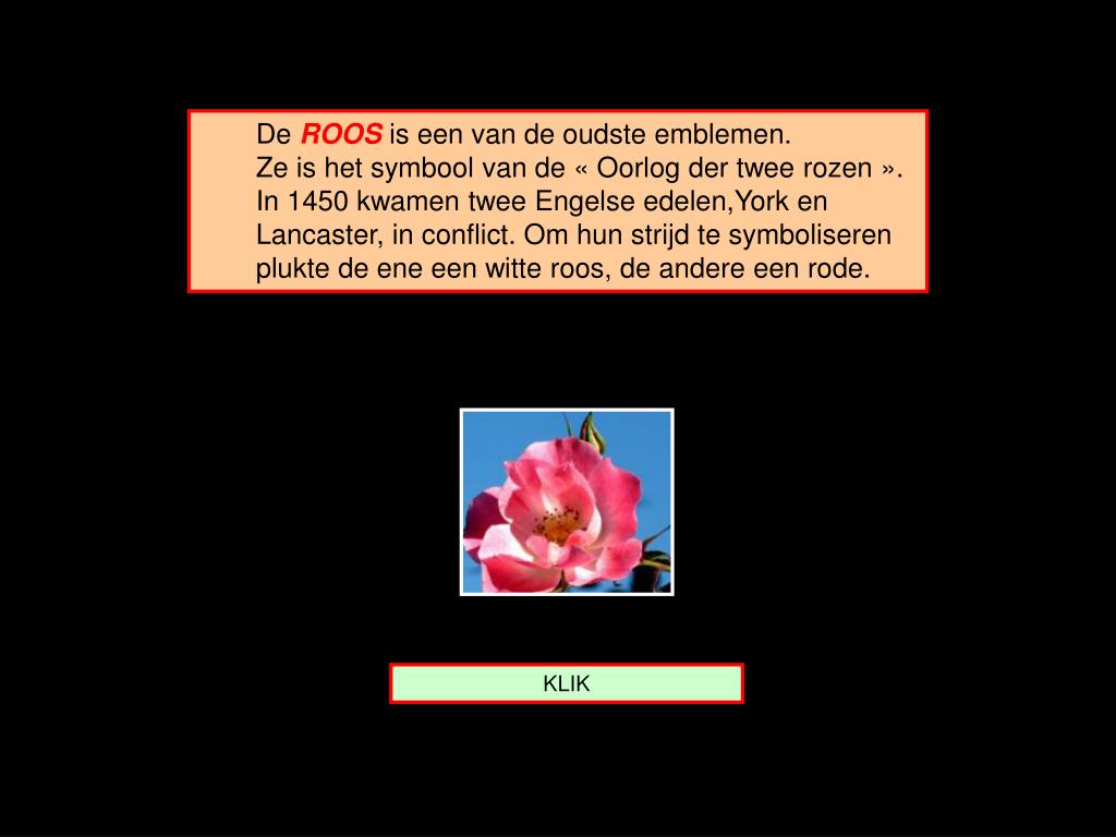 De ROOS is een van de oudste emblemen. • Ze is het symbool van de « Oorlog der twee rozen ». In 1450 kwamen twee Engelse edelen,York en Lancaster, in conflict. Om hun strijd te symboliseren plukte de ene een witte roos, de andere een rode. KLIK