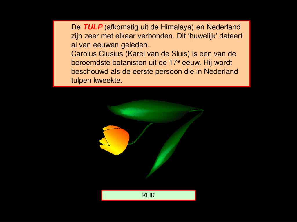 De TULP (afkomstig uit de Himalaya) en Nederland zijn zeer met elkaar verbonden. Dit ‘huwelijk’ dateert al van eeuwen geleden. Carolus Clusius (Karel van de Sluis) is een van de beroemdste botanisten uit de 17e eeuw. Hij wordt beschouwd als de eerste persoon die in Nederland tulpen kweekte. KLIK