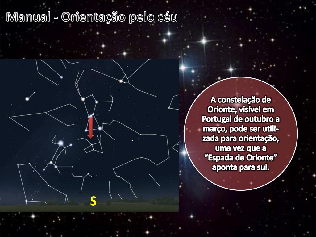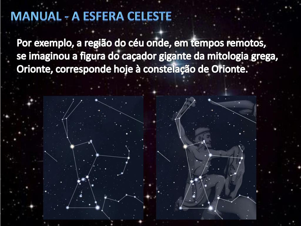 Manual - A esfera celeste Por exemplo, a região do céu onde, em tempos remotos, se imaginou a figura do caçador gigante da mitologia grega, Orionte, corresponde hoje à constelação de Orionte.