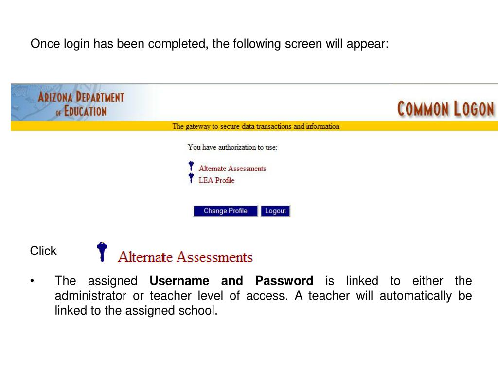 ALTERNATE ASSESSMENT. JANUARY TRAINING 2009 Data Input Step-by-Steps. Logging On to the AIMS A. Open the internet browser, go to http://www.ade.az.gov and click on Common Logon (look to the top right of the screen for this link). Type in username and password .