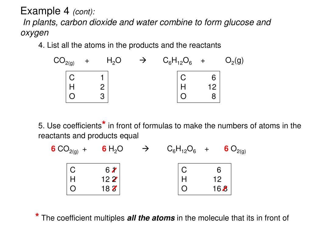C6H12O6 + O2(g) C6H12O6 + 6 O2(g) CO2(g) + H2O 6 CO2(g) + 6 H2O Example 4 (cont):In plants, carbon dioxide and water combine to form glucose and oxygen • 4. List all the atoms in the products and the reactants C 1 H 2 O 3 C 6 H 12 O 8 5. Use coefficients* in front of formulas to make the numbers of atoms in the reactants and products equal C 6 1 H 12 2 O 18 3 C 6 H 12 O 16 8 * The coefficient multiples all the atoms in the molecule that its in front of