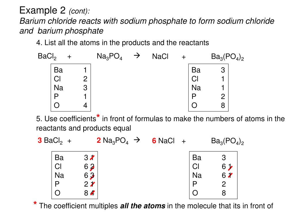BaCl2 + Na3PO4 3 BaCl2 + 2 Na3PO4 NaCl + Ba3(PO4)2 6 NaCl + Ba3(PO4)2 Example 2 (cont):Barium chloride reacts with sodium phosphate to form sodium chloride and barium phosphate • 4. List all the atoms in the products and the reactants Ba 1 Cl 2 Na 3 P 1 O 4 Ba 3 Cl 1 Na 1 P 2 O 8 5. Use coefficients* in front of formulas to make the numbers of atoms in the reactants and products equal Ba 3 1 Cl 6 2 Na 6 3 P 2 1 O 8 4 Ba 3 Cl 6 1 Na 6 1 P 2 O 8 * The coefficient multiples all the atoms in the molecule that its in front of