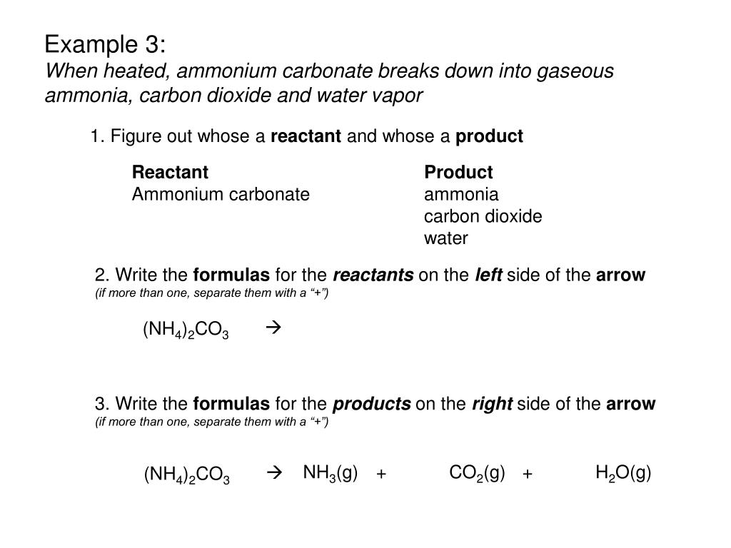 NH3(g) + CO2(g) + H2O(g) (NH4)2CO3 Example 3: When heated, ammonium carbonate breaks down into gaseous ammonia, carbon dioxide and water vapor 1. Figure out whose a reactant and whose a product ReactantProduct Ammonium carbonate ammonia carbon dioxide water 2. Write the formulas for the reactants on the left side of the arrow (if more than one, separate them with a “+”) (NH4)2CO3 3. Write the formulas for the products on the right side of the arrow (if more than one, separate them with a “+”)