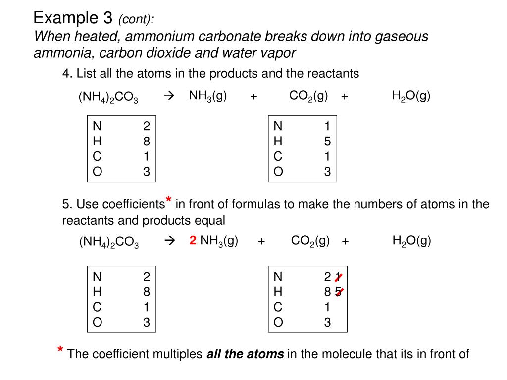 NH3(g) + CO2(g) + H2O(g) 2 NH3(g) + CO2(g) + H2O(g) (NH4)2CO3 (NH4)2CO3 Example 3 (cont):When heated, ammonium carbonate breaks down into gaseous ammonia, carbon dioxide and water vapor • 4. List all the atoms in the products and the reactants N 2 H 8 C 1 O 3 N 1 H 5 C 1 O 3 5. Use coefficients* in front of formulas to make the numbers of atoms in the reactants and products equal N 2 H 8 C 1 O 3 N 2 1 H 8 5 C 1 O 3 * The coefficient multiples all the atoms in the molecule that its in front of