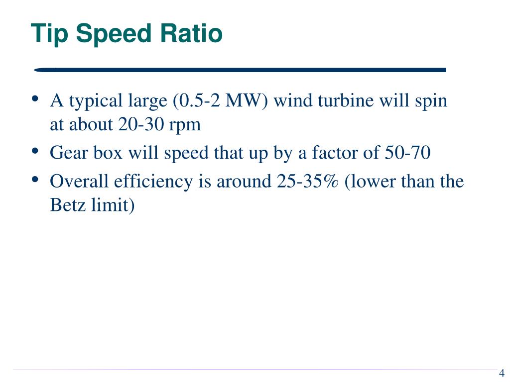 Tip Speed Ratio • A typical large (0.5-2 MW) wind turbine will spin at about 20-30 rpm • Gear box will speed that up by a factor of 50-70 • Overall efficiency is around 25-35% (lower than the Betz limit)