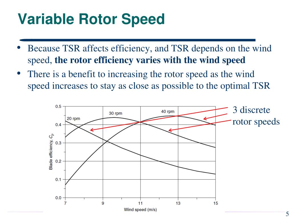 Variable Rotor Speed • Because TSR affects efficiency, and TSR depends on the wind speed, the rotor efficiency varies with the wind speed • There is a benefit to increasing the rotor speed as the wind speed increases to stay as close as possible to the optimal TSR 3 discrete rotor speeds