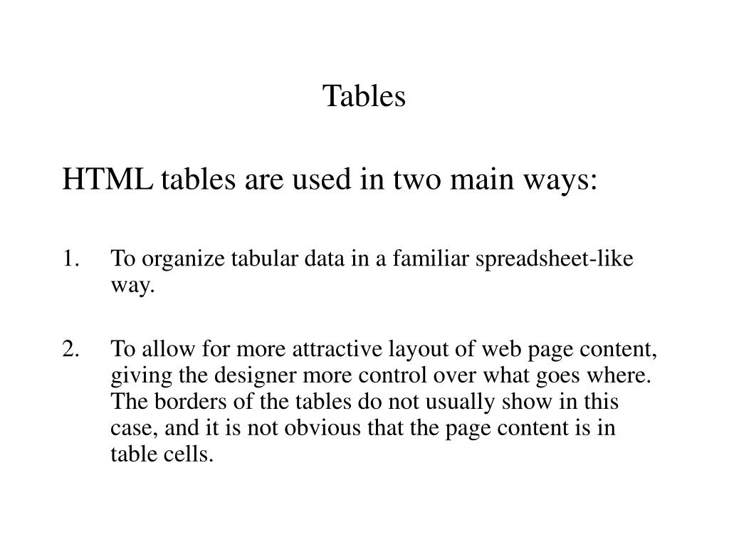 Tables HTML tables are used in two main ways: • To organize tabular data in a familiar spreadsheet-like way. • To allow for more attractive layout of web page content, giving the designer more control over what goes where.The borders of the tables do not usually show in this case, and it is not obvious that the page content is in table cells.