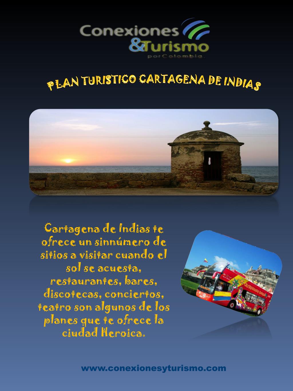 PLAN TURISTICO CARTAGENA DE INDIAS Cartagena de Indias te ofrece un sinnúmero de sitios a visitar cuando el sol se acuesta, restaurantes, bares, discotecas, conciertos, teatro son algunos de los planes que te ofrece la ciudad Heroica. www.conexionesyturismo.com
