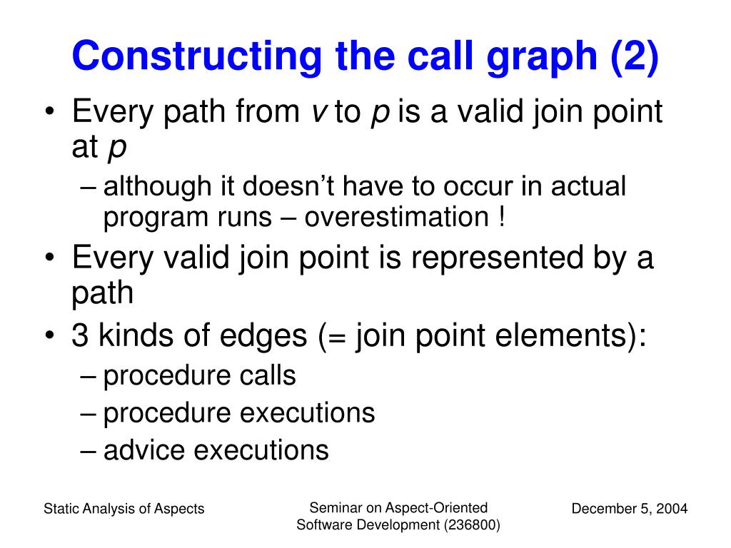 Constructing the call graph (2) • Every path from v to p is a valid join point at p • although it doesn’t have to occur in actual program runs – overestimation ! • Every valid join point is represented by a path • 3 kinds of edges (= join point elements): • procedure calls • procedure executions • advice executions Static Analysis of Aspects