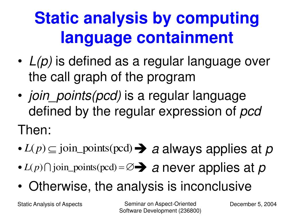 Static analysis by computing language containment • L(p) is defined as a regular language over the call graph of the program • join_points(pcd) is a regular language defined by the regular expression of pcd Then: • a always applies at p • a never applies at p • Otherwise, the analysis is inconclusive Static Analysis of Aspects