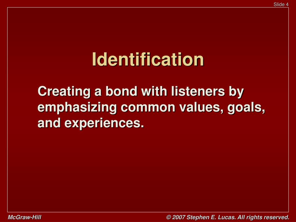 Identification Creating a bond with listeners by emphasizing common values, goals, and experiences.