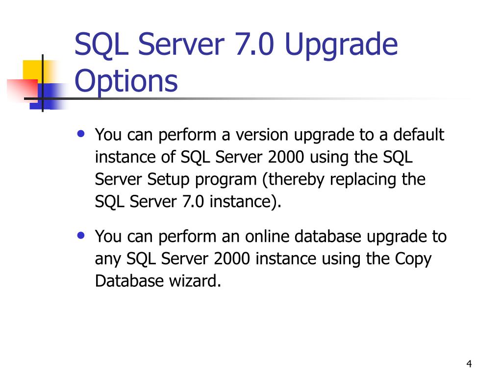 SQL Server 7.0 Upgrade Options • You can perform a version upgrade to a default instance of SQL Server 2000 using the SQL Server Setup program (thereby replacing the SQL Server 7.0 instance). • You can perform an online database upgrade to any SQL Server 2000 instance using the Copy Database wizard.