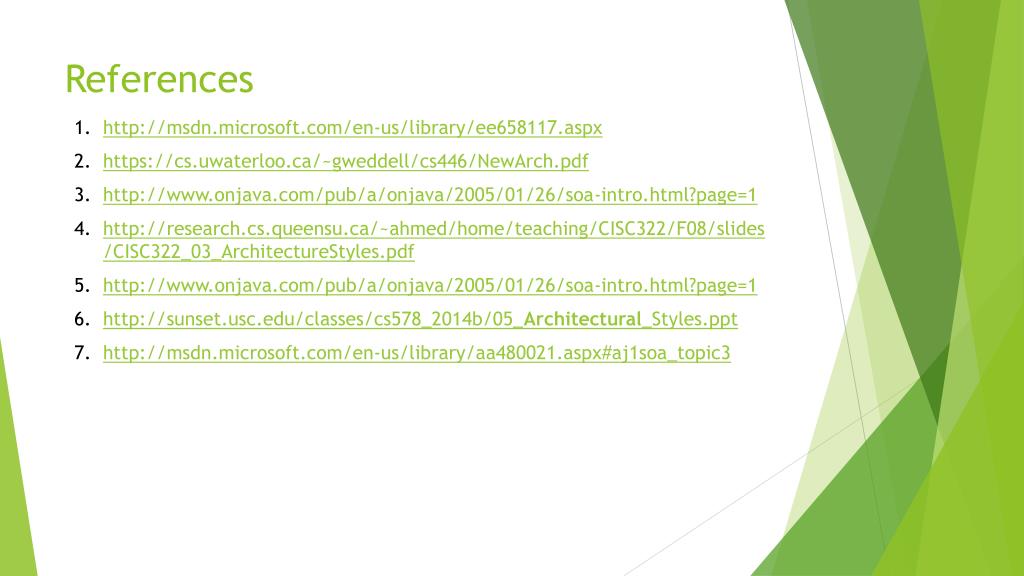 References • http://msdn.microsoft.com/en-us/library/ee658117.aspx • https://cs.uwaterloo.ca/~gweddell/cs446/NewArch.pdf • http://www.onjava.com/pub/a/onjava/2005/01/26/soa-intro.html?page=1 • http://research.cs.queensu.ca/~ahmed/home/teaching/CISC322/F08/slides/CISC322_03_ArchitectureStyles.pdf • http://www.onjava.com/pub/a/onjava/2005/01/26/soa-intro.html?page=1 • http://sunset.usc.edu/classes/cs578_2014b/05_Architectural_Styles.ppt • http://msdn.microsoft.com/en-us/library/aa480021.aspx#aj1soa_topic3