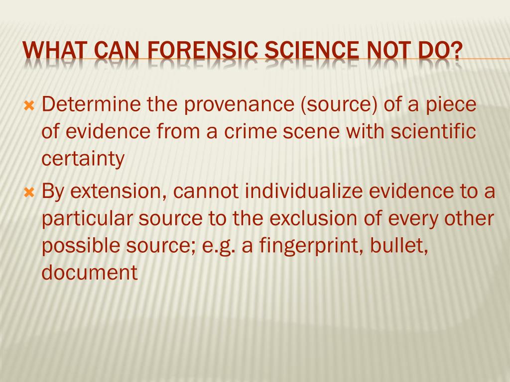 Determine the provenance (source) of a piece of evidence from a crime scene with scientific certainty By extension, cannot individualize evidence to a particular source to the exclusion of every other possible source; e.g. a fingerprint, bullet, document What can forensic science not do?