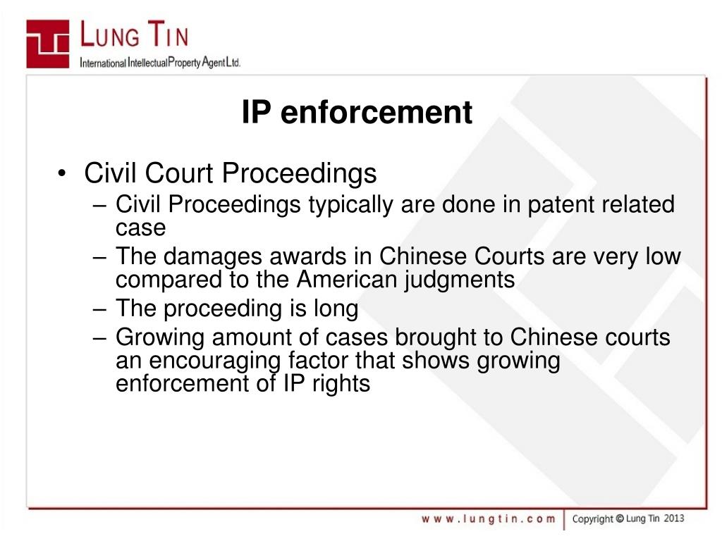 IP enforcement Civil Court Proceedings Civil Proceedings typically are done in patent related case The damages awards in Chinese Courts are very low compared to the American judgments The proceeding is long Growing amount of cases brought to Chinese courts an encouraging factor that shows growing enforcement of IP rights