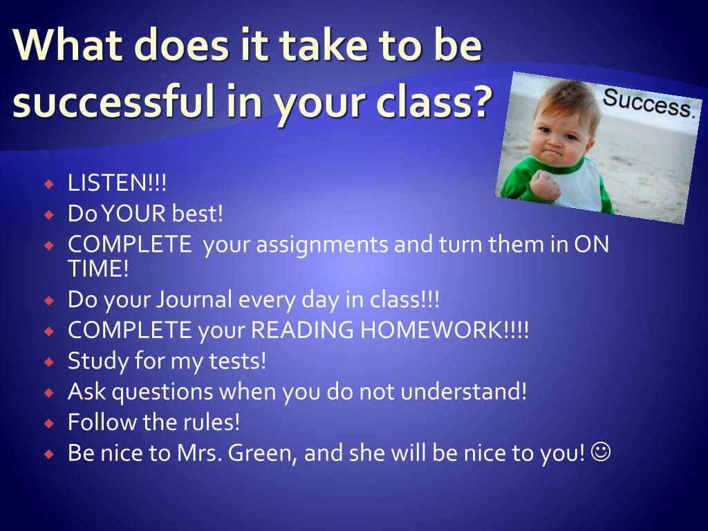 What does it take to be successful in your class? • LISTEN!!! • Do YOUR best! • COMPLETE your assignments and turn them in ON TIME! • Do your Journal every day in class!!! • COMPLETE your READING HOMEWORK!!!! • Study for my tests! • Ask questions when you do not understand! • Follow the rules! • Be nice to Mrs. Green, and she will be nice to you!