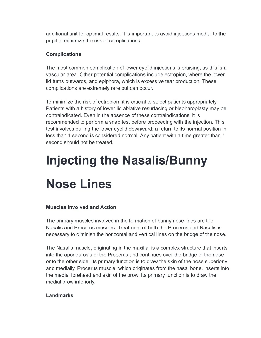 additional unit for optimal results. It is important to avoid injections medial to the pupil to minimize the risk of complications. Complications The most common complication of lower eyelid injections is bruising, as this is a vascular area. Other potential complications include ectropion, where the lower lid turns outwards, and epiphora, which is excessive tear production. These complications are extremely rare but can occur. To minimize the risk of ectropion, it is crucial to select patients appropriately. Patients with a history of lower lid ablative resurfacing or blepharoplasty may be contraindicated. Even in the absence of these contraindications, it is recommended to perform a snap test before proceeding with the injection. This test involves pulling the lower eyelid downward; a return to its normal position in less than 1 second is considered normal. Any patient with a time greater than 1 second should not be treated. Injecting the Nasalis/Bunny Nose Lines Muscles Involved and Action The primary muscles involved in the formation of bunny nose lines are the Nasalis and Procerus muscles. Treatment of both the Procerus and Nasalis is necessary to diminish the horizontal and vertical lines on the bridge of the nose. The Nasalis muscle, originating in the maxilla, is a complex structure that inserts into the aponeurosis of the Procerus and continues over the bridge of the nose onto the other side. Its primary function is to draw the skin of the nose superiorly and medially. Procerus muscle, which originates from the nasal bone, inserts into the medial forehead and skin of the brow. Its primary function is to draw the medial brow inferiorly. Landmarks