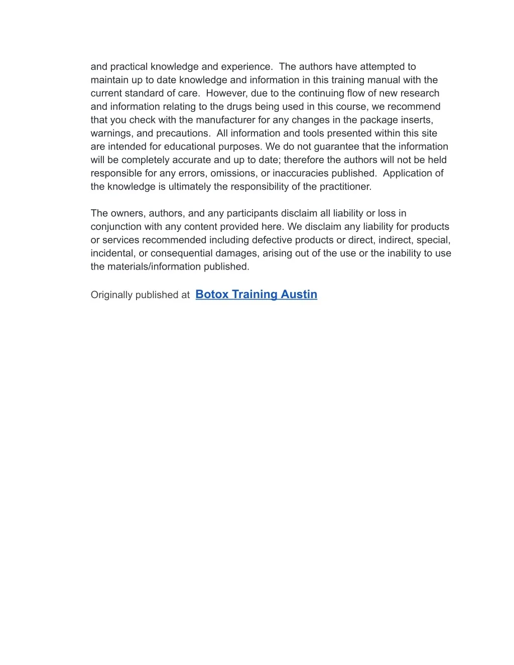 and practical knowledge and experience. The authors have attempted to maintain up to date knowledge and information in this training manual with the current standard of care. However, due to the continuing flow of new research and information relating to the drugs being used in this course, we recommend that you check with the manufacturer for any changes in the package inserts, warnings, and precautions. All information and tools presented within this site are intended for educational purposes. We do not guarantee that the information will be completely accurate and up to date; therefore the authors will not be held responsible for any errors, omissions, or inaccuracies published. Application of the knowledge is ultimately the responsibility of the practitioner. The owners, authors, and any participants disclaim all liability or loss in conjunction with any content provided here. We disclaim any liability for products or services recommended including defective products or direct, indirect, special, incidental, or consequential damages, arising out of the use or the inability to use the materials/information published. Originally published at Botox Training Austin