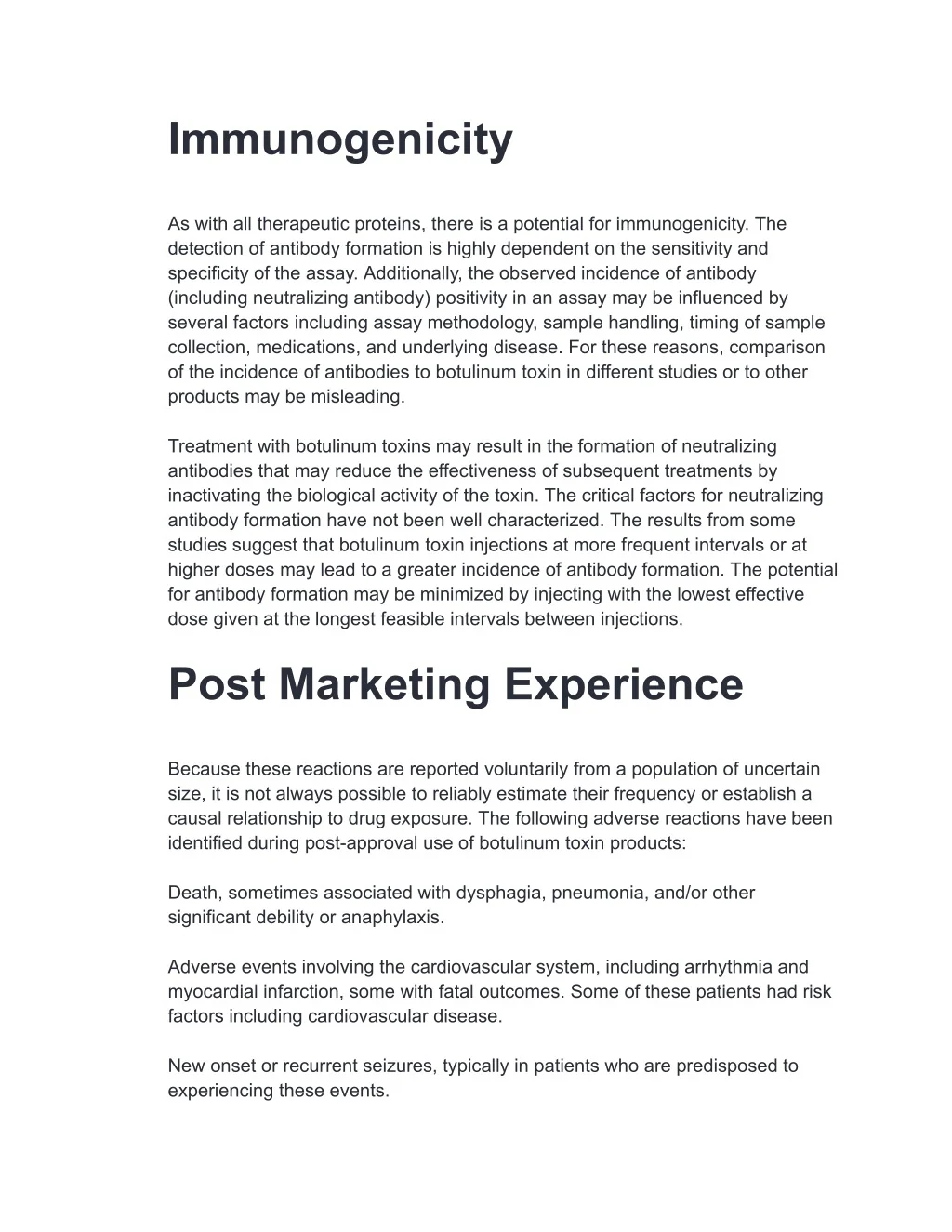 Immunogenicity As with all therapeutic proteins, there is a potential for immunogenicity. The detection of antibody formation is highly dependent on the sensitivity and specificity of the assay. Additionally, the observed incidence of antibody (including neutralizing antibody) positivity in an assay may be influenced by several factors including assay methodology, sample handling, timing of sample collection, medications, and underlying disease. For these reasons, comparison of the incidence of antibodies to botulinum toxin in different studies or to other products may be misleading. Treatment with botulinum toxins may result in the formation of neutralizing antibodies that may reduce the effectiveness of subsequent treatments by inactivating the biological activity of the toxin. The critical factors for neutralizing antibody formation have not been well characterized. The results from some studies suggest that botulinum toxin injections at more frequent intervals or at higher doses may lead to a greater incidence of antibody formation. The potential for antibody formation may be minimized by injecting with the lowest effective dose given at the longest feasible intervals between injections. Post Marketing Experience Because these reactions are reported voluntarily from a population of uncertain size, it is not always possible to reliably estimate their frequency or establish a causal relationship to drug exposure. The following adverse reactions have been identified during post-approval use of botulinum toxin products: Death, sometimes associated with dysphagia, pneumonia, and/or other significant debility or anaphylaxis. Adverse events involving the cardiovascular system, including arrhythmia and myocardial infarction, some with fatal outcomes. Some of these patients had risk factors including cardiovascular disease. New onset or recurrent seizures, typically in patients who are predisposed to experiencing these events.