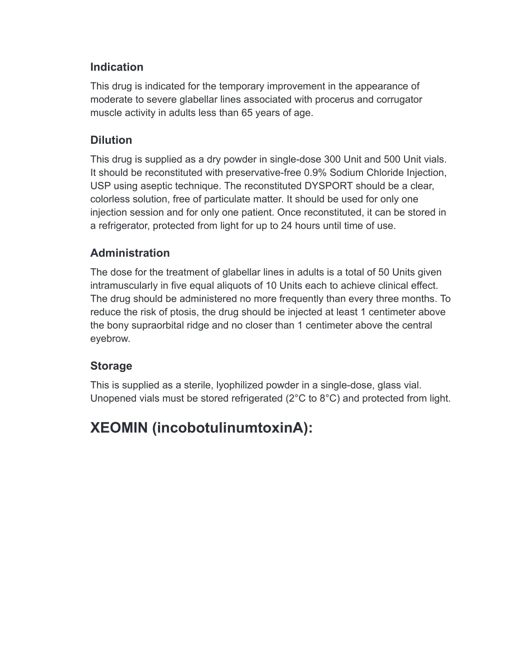 Indication This drug is indicated for the temporary improvement in the appearance of moderate to severe glabellar lines associated with procerus and corrugator muscle activity in adults less than 65 years of age. Dilution This drug is supplied as a dry powder in single-dose 300 Unit and 500 Unit vials. It should be reconstituted with preservative-free 0.9% Sodium Chloride Injection, USP using aseptic technique. The reconstituted DYSPORT should be a clear, colorless solution, free of particulate matter. It should be used for only one injection session and for only one patient. Once reconstituted, it can be stored in a refrigerator, protected from light for up to 24 hours until time of use. Administration The dose for the treatment of glabellar lines in adults is a total of 50 Units given intramuscularly in five equal aliquots of 10 Units each to achieve clinical effect. The drug should be administered no more frequently than every three months. To reduce the risk of ptosis, the drug should be injected at least 1 centimeter above the bony supraorbital ridge and no closer than 1 centimeter above the central eyebrow. Storage This is supplied as a sterile, lyophilized powder in a single-dose, glass vial. Unopened vials must be stored refrigerated (2°C to 8°C) and protected from light. XEOMIN (incobotulinumtoxinA):