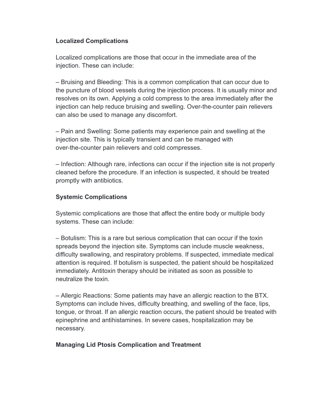 Localized Complications Localized complications are those that occur in the immediate area of the injection. These can include: – Bruising and Bleeding: This is a common complication that can occur due to the puncture of blood vessels during the injection process. It is usually minor and resolves on its own. Applying a cold compress to the area immediately after the injection can help reduce bruising and swelling. Over-the-counter pain relievers can also be used to manage any discomfort. – Pain and Swelling: Some patients may experience pain and swelling at the injection site. This is typically transient and can be managed with over-the-counter pain relievers and cold compresses. – Infection: Although rare, infections can occur if the injection site is not properly cleaned before the procedure. If an infection is suspected, it should be treated promptly with antibiotics. Systemic Complications Systemic complications are those that affect the entire body or multiple body systems. These can include: – Botulism: This is a rare but serious complication that can occur if the toxin spreads beyond the injection site. Symptoms can include muscle weakness, difficulty swallowing, and respiratory problems. If suspected, immediate medical attention is required. If botulism is suspected, the patient should be hospitalized immediately. Antitoxin therapy should be initiated as soon as possible to neutralize the toxin. – Allergic Reactions: Some patients may have an allergic reaction to the BTX. Symptoms can include hives, difficulty breathing, and swelling of the face, lips, tongue, or throat. If an allergic reaction occurs, the patient should be treated with epinephrine and antihistamines. In severe cases, hospitalization may be necessary. Managing Lid Ptosis Complication and Treatment