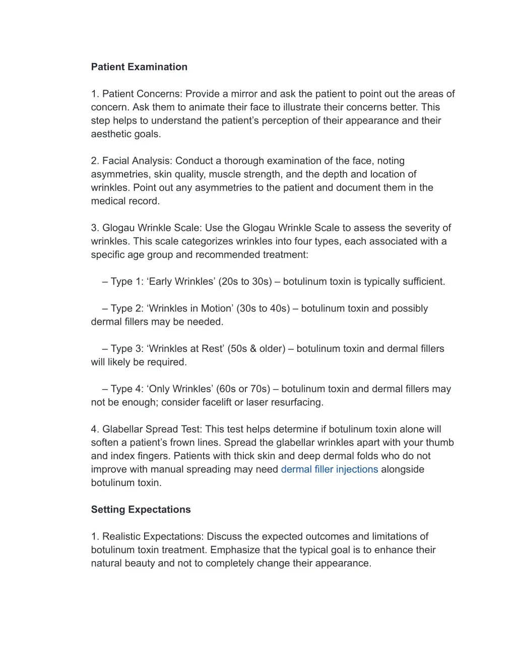 Patient Examination 1. Patient Concerns: Provide a mirror and ask the patient to point out the areas of concern. Ask them to animate their face to illustrate their concerns better. This step helps to understand the patient’s perception of their appearance and their aesthetic goals. 2. Facial Analysis: Conduct a thorough examination of the face, noting asymmetries, skin quality, muscle strength, and the depth and location of wrinkles. Point out any asymmetries to the patient and document them in the medical record. 3. Glogau Wrinkle Scale: Use the Glogau Wrinkle Scale to assess the severity of wrinkles. This scale categorizes wrinkles into four types, each associated with a specific age group and recommended treatment: – Type 1: ‘Early Wrinkles’ (20s to 30s) – botulinum toxin is typically sufficient. – Type 2: ‘Wrinkles in Motion’ (30s to 40s) – botulinum toxin and possibly dermal fillers may be needed. – Type 3: ‘Wrinkles at Rest’ (50s & older) – botulinum toxin and dermal fillers will likely be required. – Type 4: ‘Only Wrinkles’ (60s or 70s) – botulinum toxin and dermal fillers may not be enough; consider facelift or laser resurfacing. 4. Glabellar Spread Test: This test helps determine if botulinum toxin alone will soften a patient’s frown lines. Spread the glabellar wrinkles apart with your thumb and index fingers. Patients with thick skin and deep dermal folds who do not improve with manual spreading may need dermal filler injections alongside botulinum toxin. Setting Expectations 1. Realistic Expectations: Discuss the expected outcomes and limitations of botulinum toxin treatment. Emphasize that the typical goal is to enhance their natural beauty and not to completely change their appearance.