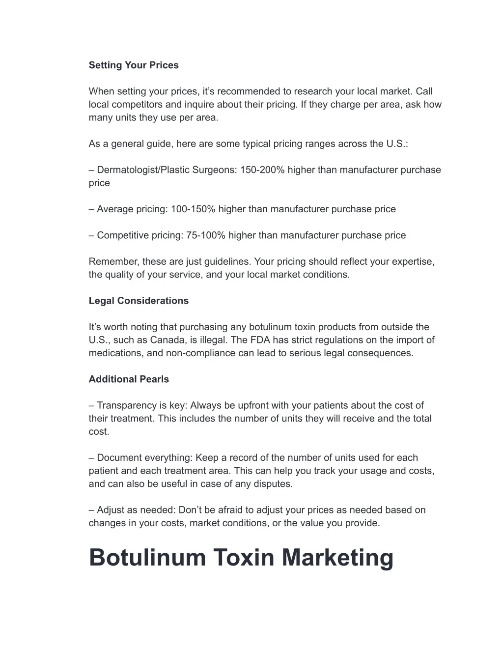 Setting Your Prices When setting your prices, it’s recommended to research your local market. Call local competitors and inquire about their pricing. If they charge per area, ask how many units they use per area. As a general guide, here are some typical pricing ranges across the U.S.: – Dermatologist/Plastic Surgeons: 150-200% higher than manufacturer purchase price – Average pricing: 100-150% higher than manufacturer purchase price – Competitive pricing: 75-100% higher than manufacturer purchase price Remember, these are just guidelines. Your pricing should reflect your expertise, the quality of your service, and your local market conditions. Legal Considerations It’s worth noting that purchasing any botulinum toxin products from outside the U.S., such as Canada, is illegal. The FDA has strict regulations on the import of medications, and non-compliance can lead to serious legal consequences. Additional Pearls – Transparency is key: Always be upfront with your patients about the cost of their treatment. This includes the number of units they will receive and the total cost. – Document everything: Keep a record of the number of units used for each patient and each treatment area. This can help you track your usage and costs, and can also be useful in case of any disputes. – Adjust as needed: Don’t be afraid to adjust your prices as needed based on changes in your costs, market conditions, or the value you provide. Botulinum Toxin Marketing