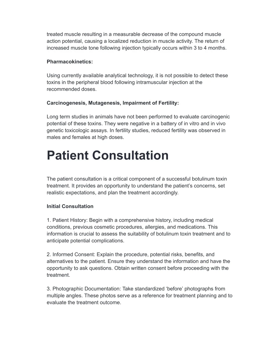 treated muscle resulting in a measurable decrease of the compound muscle action potential, causing a localized reduction in muscle activity. The return of increased muscle tone following injection typically occurs within 3 to 4 months. Pharmacokinetics: Using currently available analytical technology, it is not possible to detect these toxins in the peripheral blood following intramuscular injection at the recommended doses. Carcinogenesis, Mutagenesis, Impairment of Fertility: Long term studies in animals have not been performed to evaluate carcinogenic potential of these toxins. They were negative in a battery of in vitro and in vivo genetic toxicologic assays. In fertility studies, reduced fertility was observed in males and females at high doses. Patient Consultation The patient consultation is a critical component of a successful botulinum toxin treatment. It provides an opportunity to understand the patient’s concerns, set realistic expectations, and plan the treatment accordingly. Initial Consultation 1. Patient History: Begin with a comprehensive history, including medical conditions, previous cosmetic procedures, allergies, and medications. This information is crucial to assess the suitability of botulinum toxin treatment and to anticipate potential complications. 2. Informed Consent: Explain the procedure, potential risks, benefits, and alternatives to the patient. Ensure they understand the information and have the opportunity to ask questions. Obtain written consent before proceeding with the treatment. 3. Photographic Documentation: Take standardized ‘before’ photographs from multiple angles. These photos serve as a reference for treatment planning and to evaluate the treatment outcome.