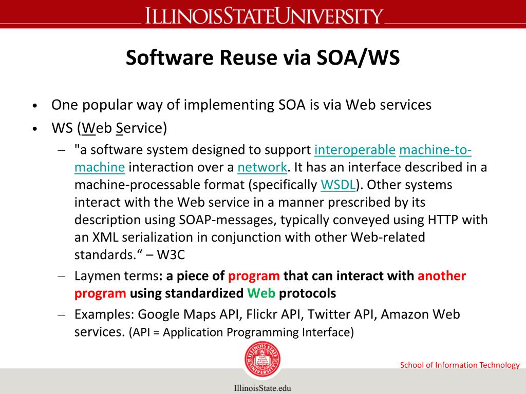 Software Reuse via SOA/WS • One popular way of implementing SOA is via Web services • WS (Web Service) • "a software system designed to support interoperablemachine-to-machine interaction over a network. It has an interface described in a machine-processable format (specifically WSDL). Other systems interact with the Web service in a manner prescribed by its description using SOAP-messages, typically conveyed using HTTP with an XML serialization in conjunction with other Web-related standards.“ – W3C • Laymen terms: a piece of program that can interact with another program using standardized Web protocols • Examples: Google Maps API, Flickr API, Twitter API, Amazon Web services. (API = Application Programming Interface)