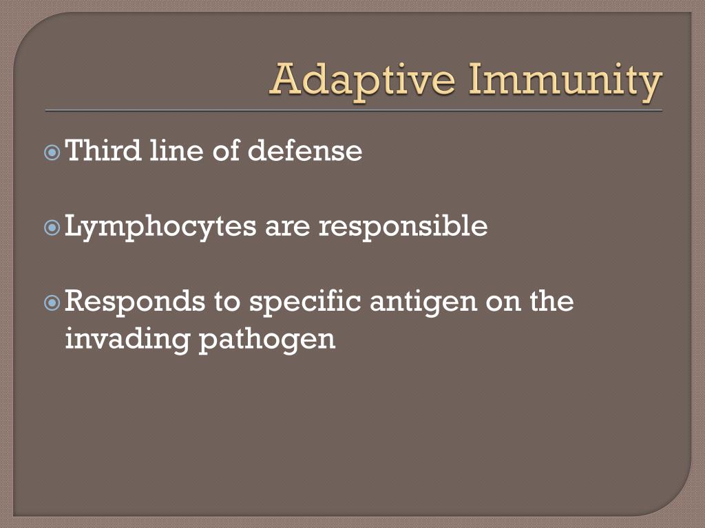 Adaptive Immunity Third line of defense Lymphocytes are responsible Responds to specific antigen on the invading pathogen