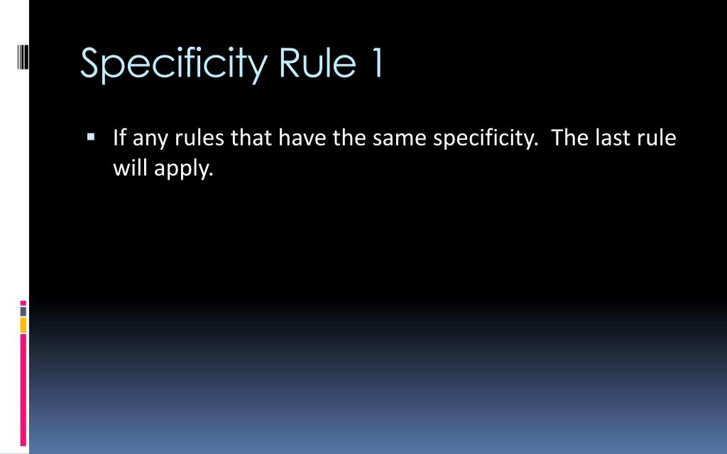 Specificity Rule 1 • If any rules that have the same specificity. The last rule will apply.