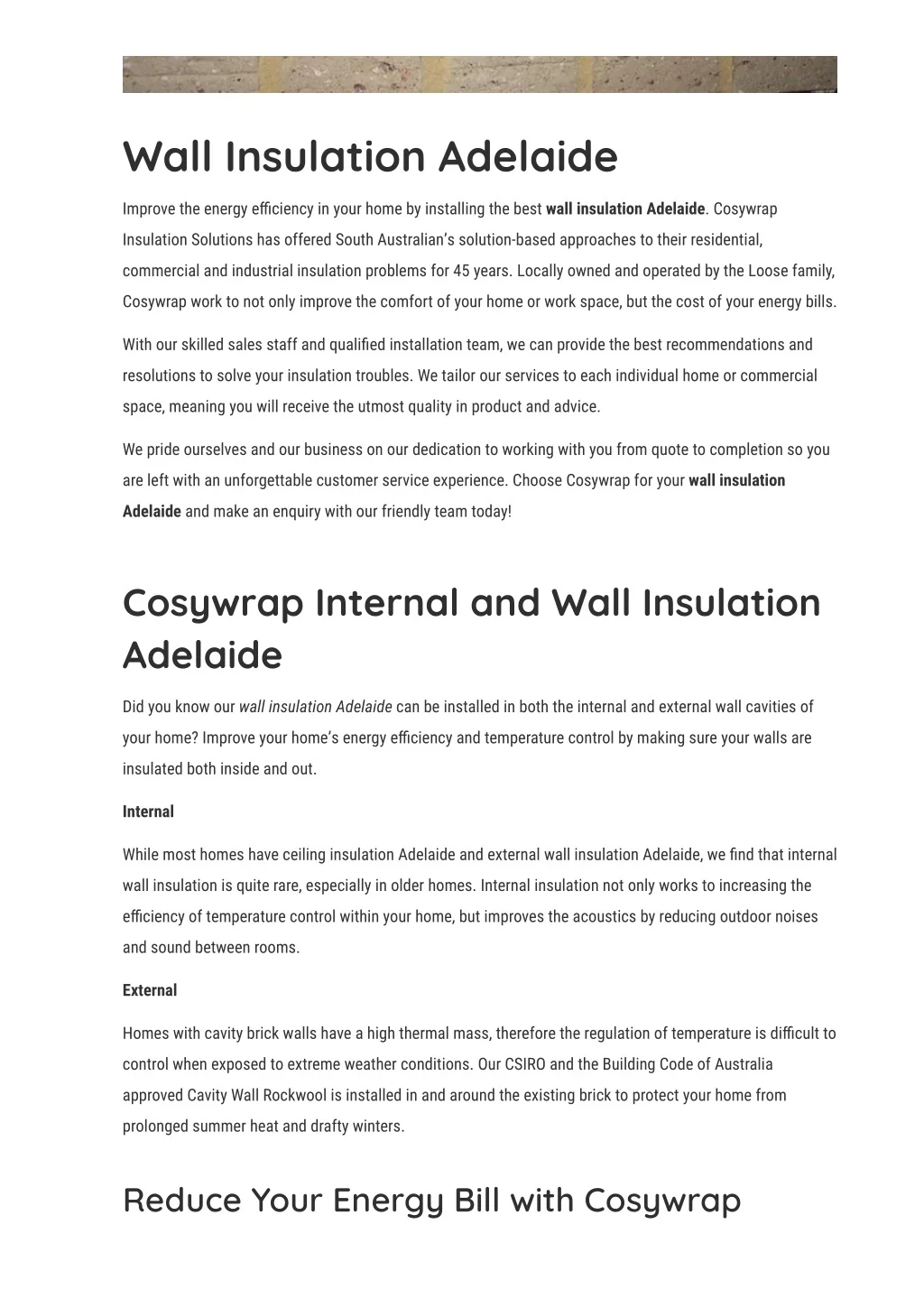 Wall Insulation Adelaide Improve the energy e몭ciency in your home by installing the best wall insulation Adelaide. Cosywrap Insulation Solutions has offered South Australian’s solution-based approaches to their residential, commercial and industrial insulation problems for 45 years. Locally owned and operated by the Loose family, Cosywrap work to not only improve the comfort of your home or work space, but the cost of your energy bills. With our skilled sales staff and quali몭ed installation team, we can provide the best recommendations and resolutions to solve your insulation troubles. We tailor our services to each individual home or commercial space, meaning you will receive the utmost quality in product and advice. We pride ourselves and our business on our dedication to working with you from quote to completion so you are left with an unforgettable customer service experience. Choose Cosywrap for your wall insulation Adelaide and make an enquiry with our friendly team today! Cosywrap Internal and Wall Insulation Adelaide Did you know our wall insulation Adelaide can be installed in both the internal and external wall cavities of your home? Improve your home’s energy e몭ciency and temperature control by making sure your walls are insulated both inside and out. Internal While most homes have ceiling insulation Adelaide and external wall insulation Adelaide, we 몭nd that internal wall insulation is quite rare, especially in older homes. Internal insulation not only works to increasing the e몭ciency of temperature control within your home, but improves the acoustics by reducing outdoor noises and sound between rooms. External Homes with cavity brick walls have a high thermal mass, therefore the regulation of temperature is di몭cult to control when exposed to extreme weather conditions. Our CSIRO and the Building Code of Australia approved Cavity Wall Rockwool is installed in and around the existing brick to protect your home from prolonged summer heat and drafty winters. Reduce Your Energy Bill with Cosywrap
