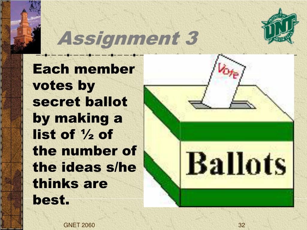 Assignment 3 Each member votes by secret ballot by making a list of ½ of the number of the ideas s/he thinks are best. GNET 2060