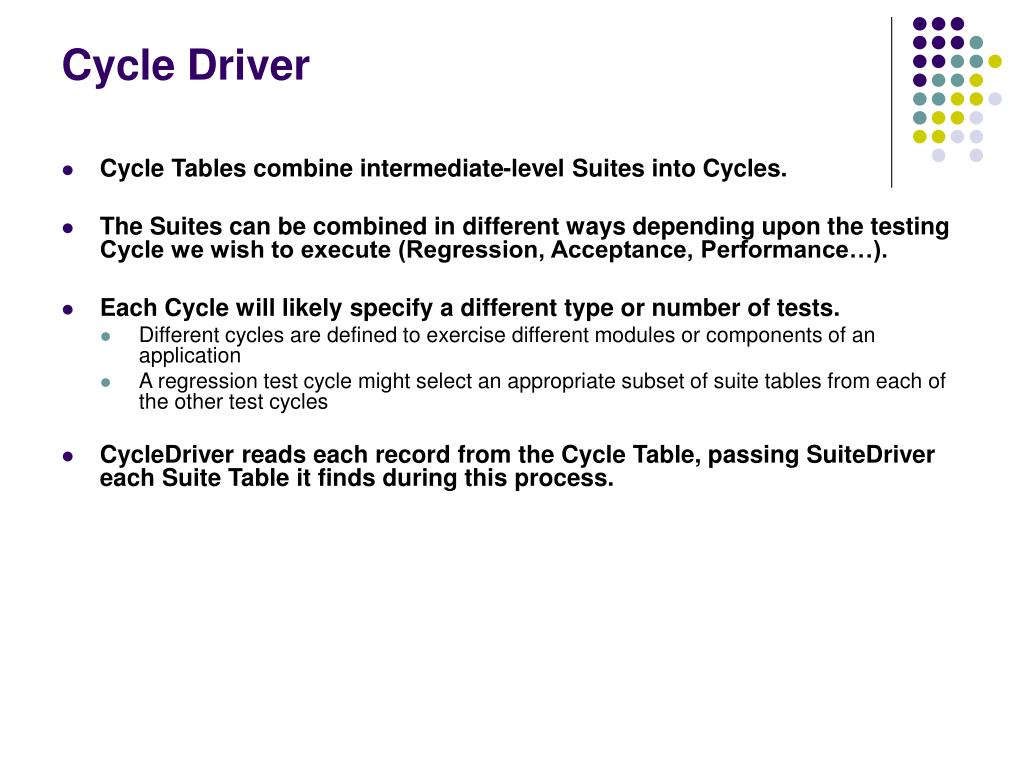 Cycle Driver • Cycle Tables combine intermediate-level Suites into Cycles. • The Suites can be combined in different ways depending upon the testing Cycle we wish to execute (Regression, Acceptance, Performance…). • Each Cycle will likely specify a different type or number of tests. • Different cycles are defined to exercise different modules or components of an application • A regression test cycle might select an appropriate subset of suite tables from each of the other test cycles • CycleDriver reads each record from the Cycle Table, passing SuiteDriver each Suite Table it finds during this process.